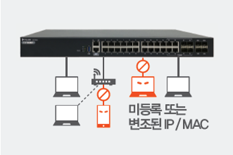 노트북, 태블릿PC, 스마트폰, 무선공유기 등 다양한 단말을 식별하고, 등록된 단말이 아닐 경우 내부망 접근 차단 (위/변조된 IP/MAC, NAT 장비 포함)