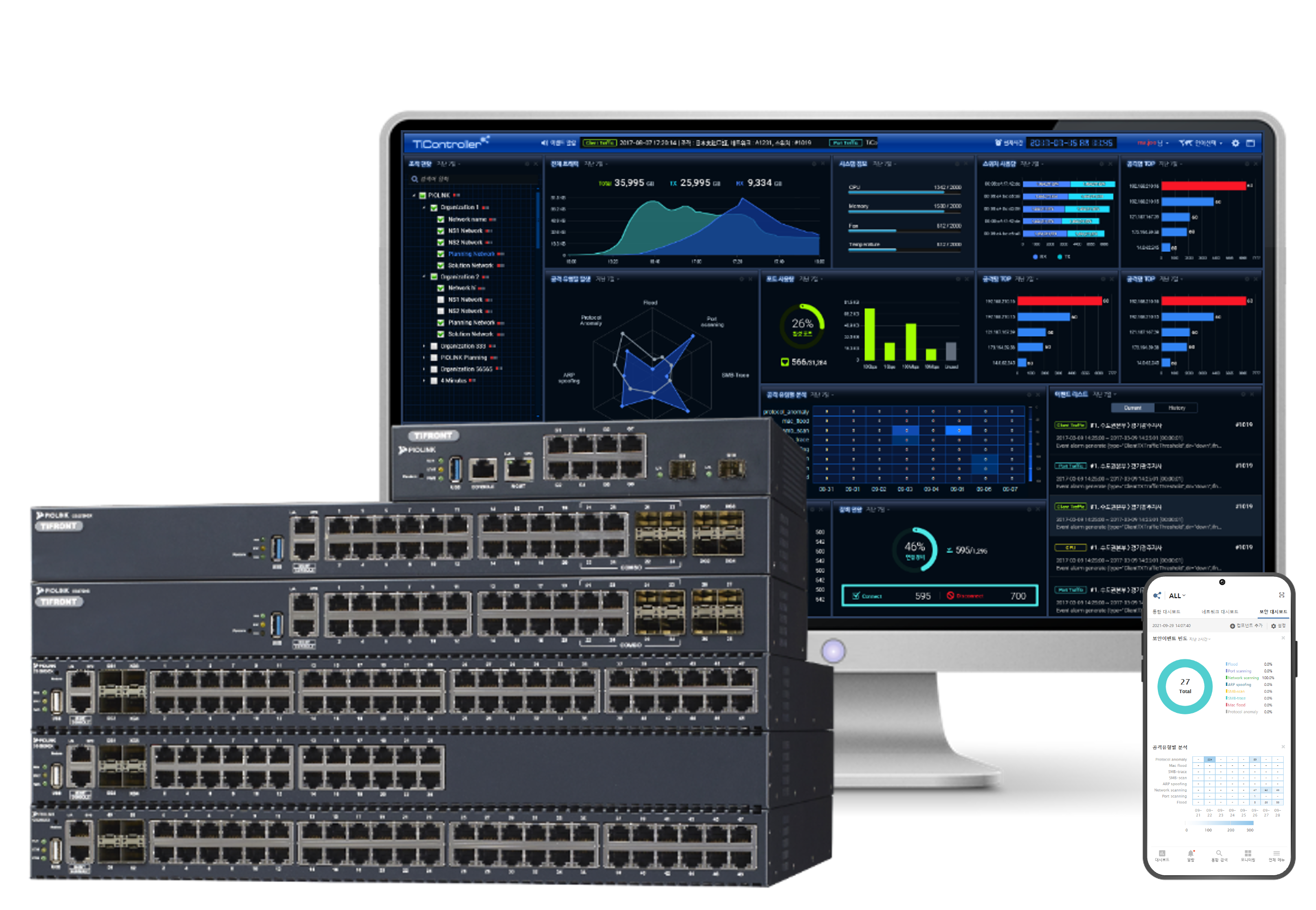 클라우드 기반 통합관리 시스템인 TiController를 통해 엔드포인트와 네트워크에 대한 보안과 가시성을 쉽게 파악하고 다수의 스위치를 중앙집중 관리할 수 있어 IT 관리 인력과 비용을 줄여줍니다.